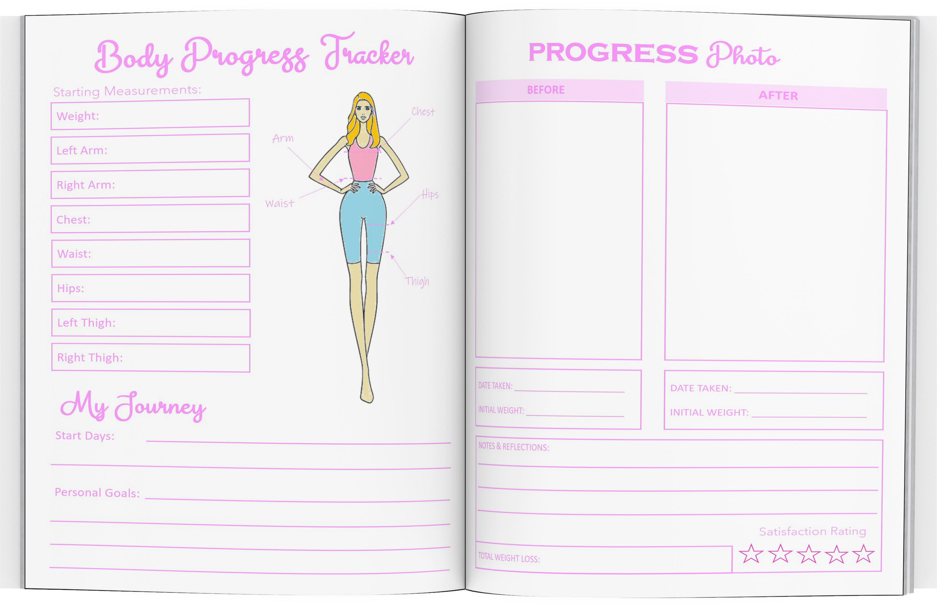 ✔ Body Progress Tracker - Starting Measurement (Weight, Left Arm, Right Arm, Chest, Waist, Hips, Left Tight, and Right Tight), illustration of a model (Girl Model), Journey of your Start Days and Personal Goals.